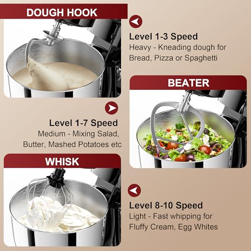 10+P Speed & 8-In-1 Splash Guard: This stand mixer features multiple speeds settings, offering precise control for mixing, kneading, and whipping, making it ideal for baking bread, cakes, and cookies. Upgraded splash-proof cover with multifunctional features — measuring cup and stick, dough cutter, egg white separator and toothed cutter, for food preparation