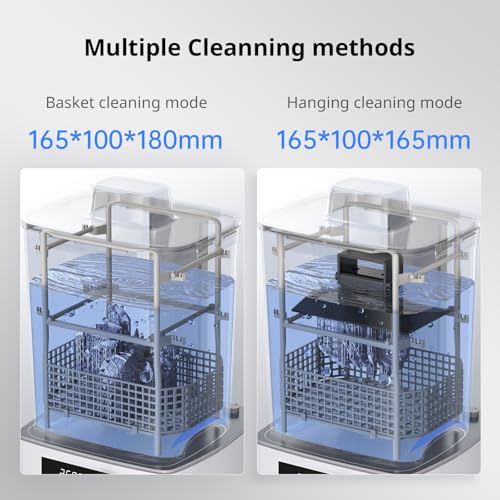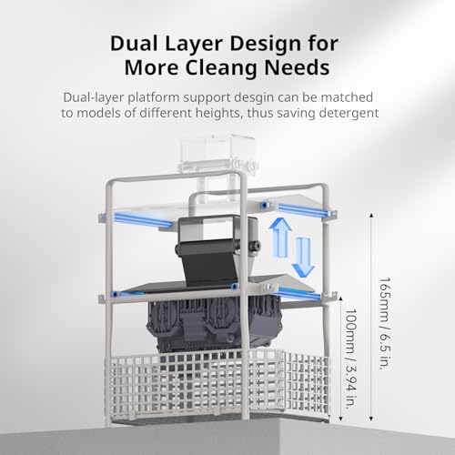 【Dual-layer Design】Wash& Cure 3.0 double-layered PP material cleaning basket supports simultaneous cleaning of platforms and is designed to save detergent with two adjustable heights of 100 mm and 165 mm to flexibly accommodate printing platforms from 5.9’’ to 7.3’’.