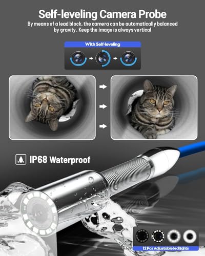 Easy to Operate and Versatile Camera Probe: The plumbing camera system facilitates effortless video recording and photography! Simply press the corresponding button to record videos, take photos, and view recorded videos and pictures. The IP68 waterproof sewer camera features a 140° wide-angle lens and 12 adjustable brightness LED lights. Just turn the knob to select the appropriate brightness as needed, ensuring clear visibility during inspections.