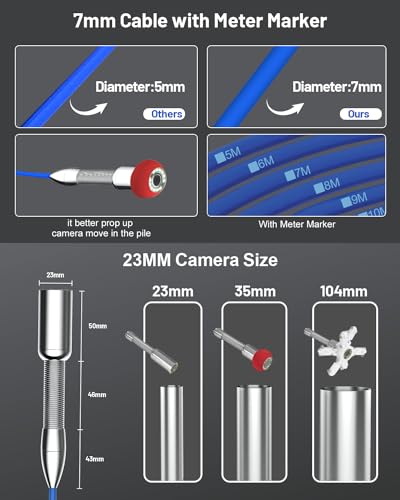Thicker Cable for Durability and Counter: Compared to other product‘s cable 5mm on the market, this 7mm pipe inspection camera’s cable is thicker, making it more robust. The cable is marked every meter, aiding in measuring the camera’s distance during surveys. The portable all-in-one duct inspection camera system allows the pushrod to be separated from the accessories, keeping the accessories in the box clean after each use and making it easy to operate the cables.