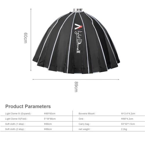 💡【Size】The Light Dome III is the flagship softbox for Aputure’s Bowens Mount lights, featuring the same 3ft (88cm) circular shape with a brand new quick-folding, flat-pack design.From film sets to broadcast studios, product photography to live streaming, the Light Dome III satisfies the professional soft lighting needs of creators in a wide range of shooting environments