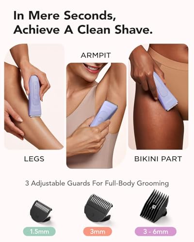 VERSATILE WOMEN VERSION HAIR TRIMMER: Perfect for bikini, pubic, underarm, legs, arms, and other body areas! Our electric trimmer offers three guard comb lengths (1.5mm, 3mm, 3-6mm) to suit any preference. Choose your desired length, trim long hair short, then switch to the skin-protective ceramic blades for a smooth finish. For shorter hair, remove the guard comb and trim directly with the skin-protective blade.