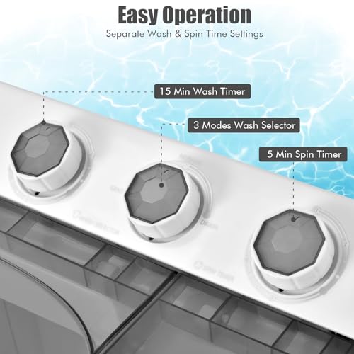 [26Lbs Large Capacity] Our compact twin tub washing machine has a total capacity of 26 pounds. You can simultaneously put 18 pounds of clothes into the laundry tub and 8 pounds of clothes into the spin tub to save valuable time. In addition, the transparent lid allows for easy inspection of the washing/spinning process at any time.