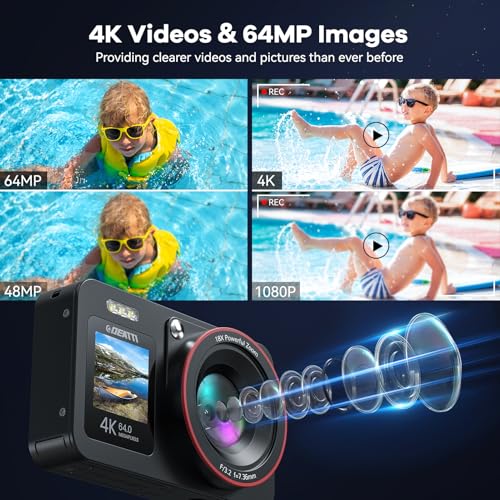 DEATTI Digital Camera FHD 4K 64MP with Dual Screens 64GB SD Card 2 Batteries,18X Zoom,Anti Shake Portable Rechargeable Selfie Camera for Teens Boys Girls Kids
