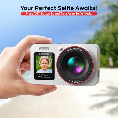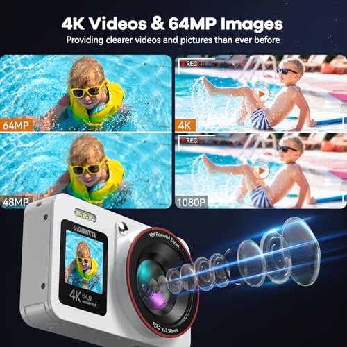 Deatti Digital Camera,FHD 4K Camera with Dual Screen 64GB SD Card 2 Batteries,Digital Point and Shoot Camera,18X Zoom,Anti Shake Portable Rechargeable for Boys Girls Kids,White