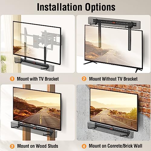 Multiple Installations: The soundbar mount bracket has 4 installation options: Mount with TV wall mount brackets, directly mount above TV, mount on wood studs, mount on concrete/brick wall with concrete anchors included