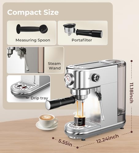 Espresso Machine with Milk Frother, 20 Bar High Pressure Professional Espresso Maker Automatic, Compact Stainless Steel Coffee Machine for Cappuccino, Latte, Gift for Coffee Lover, Silver