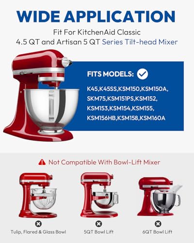 Fits KitchenAid 4.5-5qt tilt-head stand mixers:K45, K45SS, KN15,KDM90, KA15, BEA30, RRK150, KSM45, KSM75, KSM85, KSM88, KSM90, KSM95, KSM96, KSM100, KSM103, KSM106, KSM110, KSM111, KSM120, KSM125, KSM150, KSM151, KSM152, KSM153, KSM154, KSM155, KSM156, KSM160, KSM170, KSM175, KSM177, KSM180,KSM195, KSM200 .If you are not sure whether your model is suitable, please feel free to contact us. (Note: this part does not belong to KitchenAid)