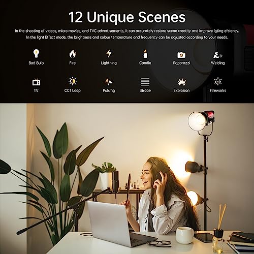 12 LIGHT EFFECT&12 LIGHT SOURCE MATCHING: Photography lighting Provides 3 light modes: CCT, Source, Effect mode. With high color rendering index CRI 97+ & TLCI 97+, has upgraded the CCT adjustment accuracy from 100 to 50, and the adjustment is more precise.video lighting provides 12 light effects and 12 different styles of light source types to make a choice from, which can save numerous adjustment time when you want a specific light source.