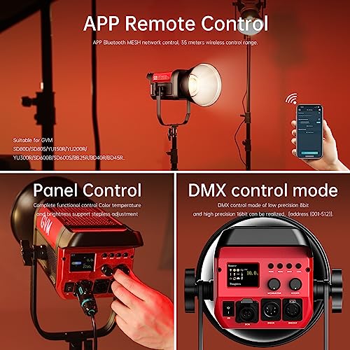 APP & PUSH BUTTON CONTROL: Studio Light can be controlled by your IOS and Android smart mobile devices. It also supports Bluetooth mesh networking and can be controlled in groups with GVM devices that support mesh networking. Video lights can panel control, which can smoothly adjust parameters such as brightness, color temperature, red and green compensation, color and light effect. In addition, the Photo light also has DMX control function.