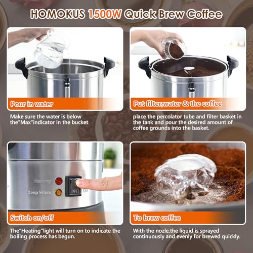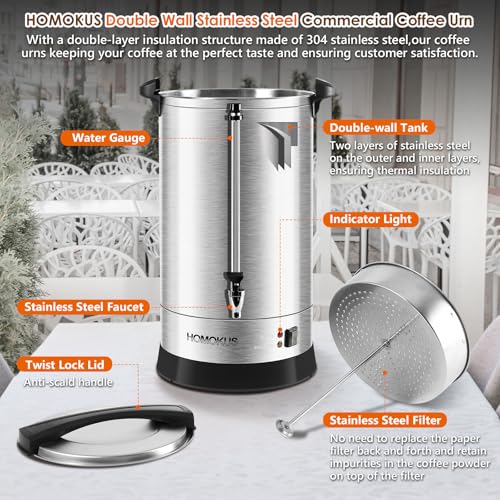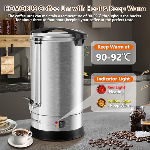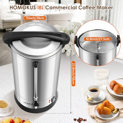 HOMOKUS Commercial Coffee Urn, 18L 120 Cup Extra Large Coffee Maker with Upgraded Internal Stage, Double Wall Stainless Steel Drink Coffee Dispenser, 1500W Quick Brew Electric Percolator for Party