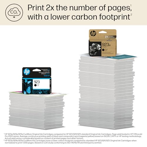 HP 923e Black EvoMore ink cartridges for HP printers provide legendary performance, quality, and sustainability, meeting your everyday office, home, and school printing needs. HP’s unique formula delivers precision output for professional, fade-resistant documents and brilliant images. These HP printer cartridges offer a higher page yield of approximately 1,000 pages, reducing replacement frequency and waste. The HP printer ink cartridges are designed for compatibility with select HP OfficeJet and OfficeJet Pro series printers for hassle-free installation and performance. Contribute to sustainability efforts with easy recycling through HP Planet Partners and a low carbon footprint.