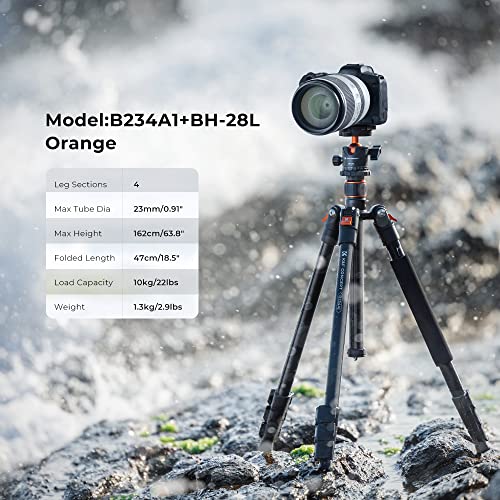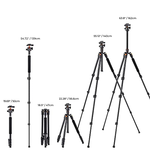 K&F Concept 64 inch/162cm Camera Tripod, Compact Aluminum Alloy Travel Tripods with 28mm Metal Ball Head 10KG/22lbs Load Capacity, Detachable Monopod, for SLR DSLR Digital Camera(B234A1+BH-28L)