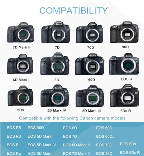 COMPATIBILITY: LP-E6NH coiled dummy battery Cable for Canon 80D, 70D, 60D, 90D, 6D, 7D, 7D Mark II, 6D Mark II, 5D Mark II, 5D Mark IV, 5D Mark III, EOS R, R5, R6, R6 Mark II, R7, 60Da, 5Ds, 5Ds R Cameras. Replacement for Canon LP-E6 LP-E6N LP-E6NH battery. (Note: Not compatible with Canon EOS R5 II, R5 Mark II)