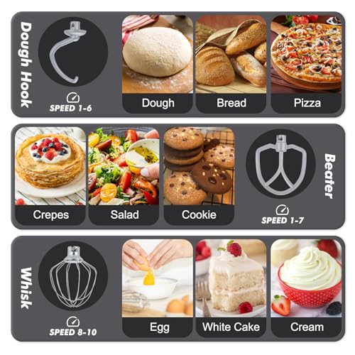 Upgraded Accessories and Dishwasher Safe- Aluminium dough hook and flat beater with protection layer,stainless steel whisk are all easy to attach,more sturdy and durable. The stainless steel bowl and all accessories are dishwasher-safe for effortless cleanup.