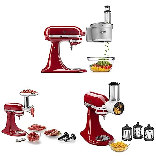 KitchenAid KSM2FPA Food Processor Attachment, Dicing Kit, Silver & KitchenAid KSMMGA Metal Food Grinder Attachment, Silver & KitchenAid Fresh Prep Slicer/Shredder Attachment, White