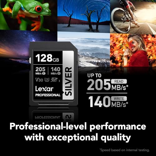 Lexar 128GB Professional Silver SD Card, UHS-I, C10, U3, V30, 4K, Up to 205/140 MB/s SDXC Memory Card, for Professional Photographer, Videographer, Enthusiast (LSDSILV128G-BNNNU)