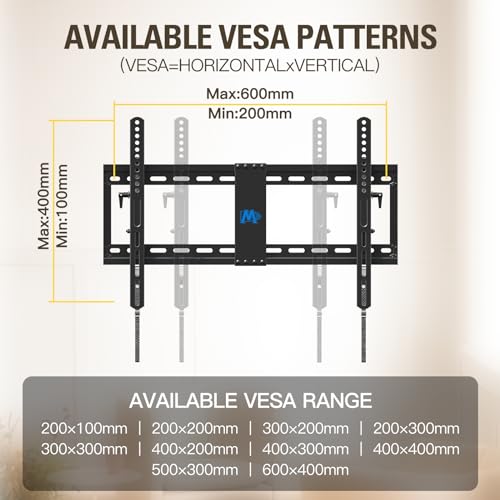 Universal Design TV Mount: Advanced tilt TV wall mount fits for most 42-90 inch TVs up to 120 lbs. with MAX VESA of 600mm x 400mm and 16″, 18″, 24″ wood studs spacing. Please check the TV VESA, TV weight, compatible wall types (wood studs spacing or concrete wall) and possible blocked input before purchasing.