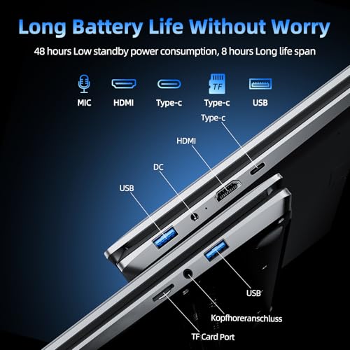 Long Lasting Battery: Equipped with a 8000 mWh lithium-ion battery, long battery life. Naclud laptop has a long battery life and reliable performance. It features a Type-C port, HDMI (for external monitors/projectors), dual USB 3.2 ports, a 3.5mm headphone jack, and a MicroSD card slot (expandable up to 512GB)