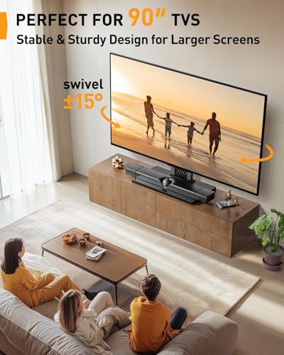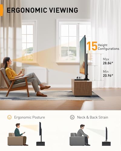 【15 Levels of Height Adjustment】Find your ideal viewing height with 15 levels of customizability, featuring three mounting bar adjustments and five column height settings. Whether you’re setting up a tabletop TV stand for a casual entertainment area or need an adjustable TV stand for a more flexible arrangement, this stand adapts to your needs while reducing neck strain and enhancing your overall experience.