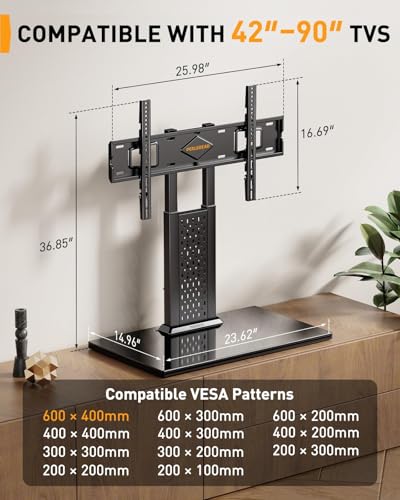 【Universal TV Stand for 42-90 inch-Tailored for Large Screens】The table top TV stand fits 32″,40″,42″,43″,50″,55″,60″,65″,70″,75″,80″,82″,83″,90″ flat-panel LCD/LED TVs, with VESA pattern sizes from 100x100mm, 100x200mm, 200x100mm, 200x200mm, 200x300mm, 300x200mm, 300x300mm, 400x200mm, 400x300mm, 400x400mm,600x400mm, Before purchasing, confirm your TV’s VESA pattern, weight, and input placement to ensure a perfect match.