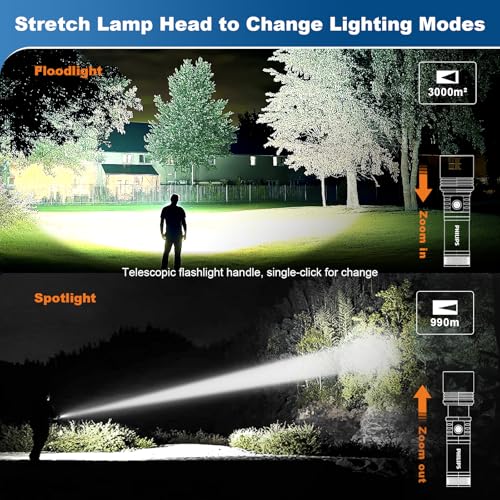 【Super Bright Zoomable Flashlight】- Philips LED Flashlight offering 1500 lumens. Its adjustable zoom lets you switch between spotlight and floodlight by Stretch Flashlight Handle, illuminating objects up to 5,000 feet or covering two football fields. Five Lighting Modes also suit your different needs