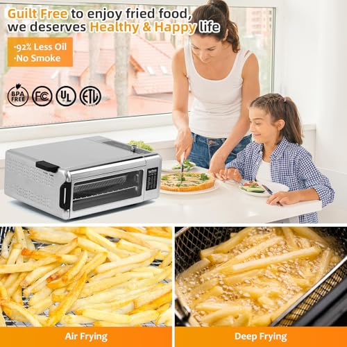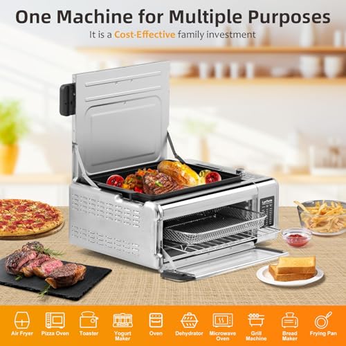 【Unique design】The air fryer toaster oven showcases a novel openable top-cover design. When you open the lid, the oven seamlessly transforms into an electric grill or an electric frying pan. When the lid is opened, the height of the appliance reaches 18.9″. Additionally, opening it upwards significantly facilitates the cleaning and maintenance of the machine.