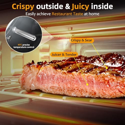 【Multiple functions】Equipped with an intelligent cooking system and 9 preset functions, this countertop oven is a versatile kitchen workhorse. The convection oven can perform various tasks, from air-baking to air-frying, dehydrating, and reheating. This ensures that your food is cooked to perfection, achieving the ideal balance of crispiness and tenderness.