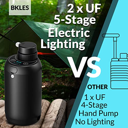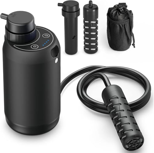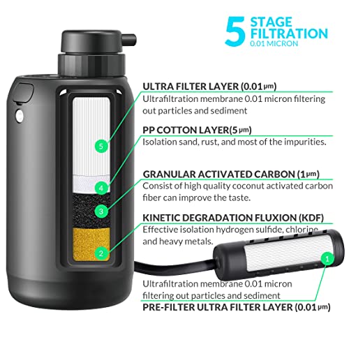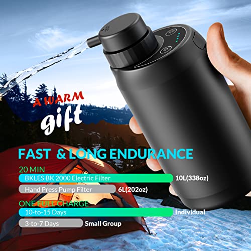 [Fast and Long Endurance] Ultra fast purified water waft of 700ml (23 oz.) per minute.Built in large capacity lithium battery, one charge can purify 168000ml(5681 oz.) of water, enough for 10-to-15-day backpacking and a couple of people to use at the same time.It may be powered in a couple of ways: mobile power supply, solar panel, vehicle power supply and the like.
