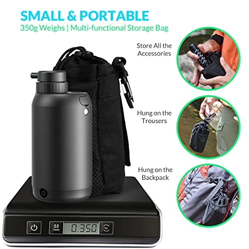 [Light, Small and Portable] Only weighs 350g and is small in size; The multi-functional storage bag can store all of the accessories, and will also be easily hung at the backpack, belt and trousers and the like.