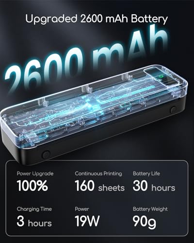 Portable Printers Wireless for Travel [Compact & Space-saving]: Portable printer built-in 2600mAh rechargeable battery, print 160 sheets of 8.5” x 11” thermal paper per charge. Weighs only 1.5lb and is small in size. This inkless portable printer fits easily into a backpack or briefcase! Ideal for on-the-go printing during business travel, in car or truck, small office, construction site, school and home use. You can print documents, contracts, invoices and boarding passes anytime, anywhere
