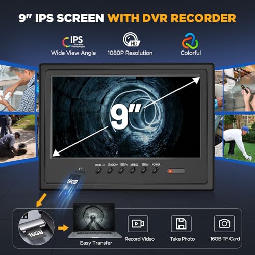 Capture and Save with Clarity: Equipped with a 9-inch TFT color LCD monitor, our sewer camera delivers sharp, real-time inspection visuals. Save extensive video and photo records directly to the included 16GB SD card, perfect for thorough documentation