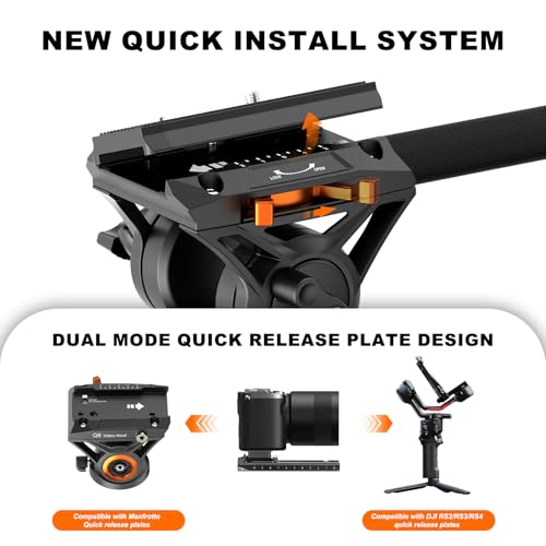 【Upgraded Q6 Video Fluid Head】 The video monopod with new upgraded Q6 fluid video head, compatible with DJI RS2/RS3/RS4 , Manfrotto quick release plate, supports 360° panoramic view and +90 °/-60 ° tilt, means that you can take panoramic, low-angle, and overhead shots easily