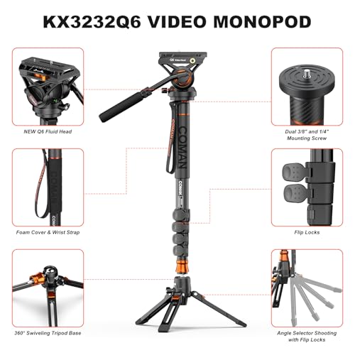 【3-in-1 Tripod Stand】COMAN professional monopod tripod with fluid head provides 3 options to be used: 1) Fixed camera monopod with adjustable feet, 2) Portable monopod stand, 3) Low angle camera tripod with base. Monopod for camera make stronger feet with One-touch vertical locking knob, can hold steady on uneven ground, which isconvenient and fast. The tripod feet on my own can also create a desktop tripod stand