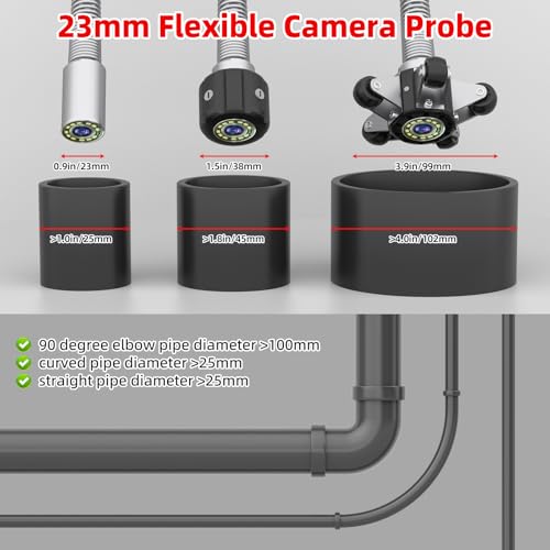 Reach Anywhere: The 0.2in (5mm) cable with a highly flexible 0.9in (23mm) camera head provides easy access to narrow pipes and cracks. It includes a pipe pulley for pipes over 1.57in (40mm) and a roller guide wheel for pipes larger than 5.12in (130mm), ensuring versatile and efficient inspections in a variety of pipe sizes