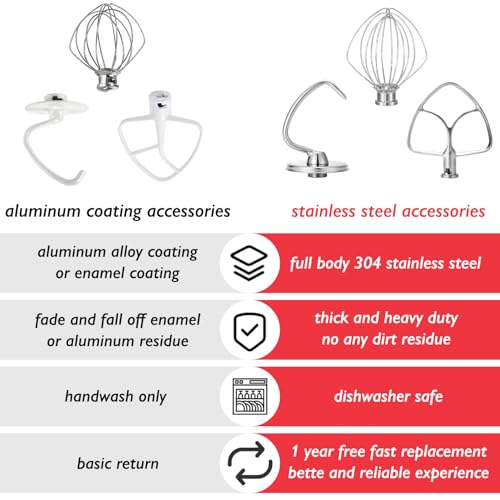 Stainless Steel Accessories for KitchenAid 4.5-5 Qt Tilt Head Stand Mixer, Includes 6 Wire Whisk, Flat Beater, Dough Hook for KitchenAid, Dishwasher Safe and Heavy Duty, Fits for KSM45, KSM150