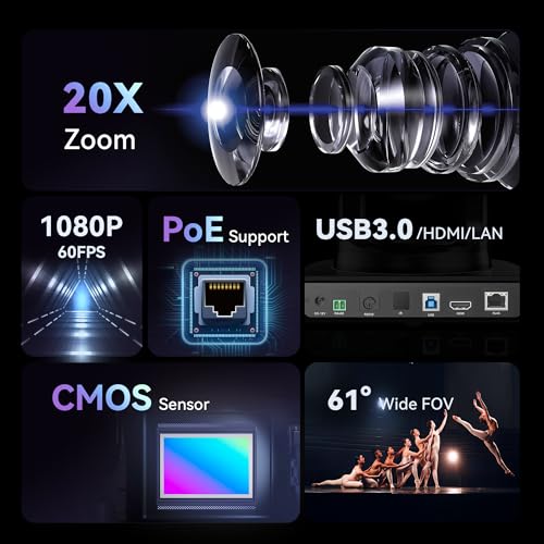 Tenveo HDMI/LAN/USB3.0 PoE PTZ Camera 20X Optical Zoom PTZ Camera IP Live Streaming, FHD 1080P 60FPS, for Church Services Worship Video Conference Live Streaming Online Meeting, 2025 Version