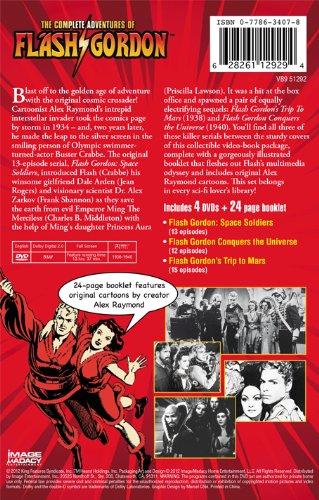 Blast off to the golden age of adventure with the original cosmic crusader! Cartoonist Alex Raymond’s intrepid interstellar invader took the comics page by storm in 1934 – and, two years later, he made the leap to the silver screen in the smiling person of Olympic swimmer-turned-actor Buster Crabbe. The original 13-episode serial, Flash Gordon: Space Soldiers, introduced Flash (Crabbe), his winsome platinum blonde girlfriend Dale Arden (Jean Rogers) and visionary scientist Dr. Alex Zarkov (Frank Shannon) as they save the earth from evil Emperor Ming The Merciless (Charles B. Middleton) with the help of Ming’s daughter Princess Aura (Priscilla Lawson). It was a hit at the box office and spawned a pair of equally electrifying sequels: Flash Gordon’s Trip to Mars (1938) and Flash Gordon Conquers the Universe (1940). You’ll find all three of these killer serials between the sturdy covers of this collector’s edition Video-Book package, complete with a gorgeously illustrated booklet that fleshes out Flash’s multimedia odyssey and includes original Alex Raymond cartoons. This set belongs in every sci-fi lover’s library!