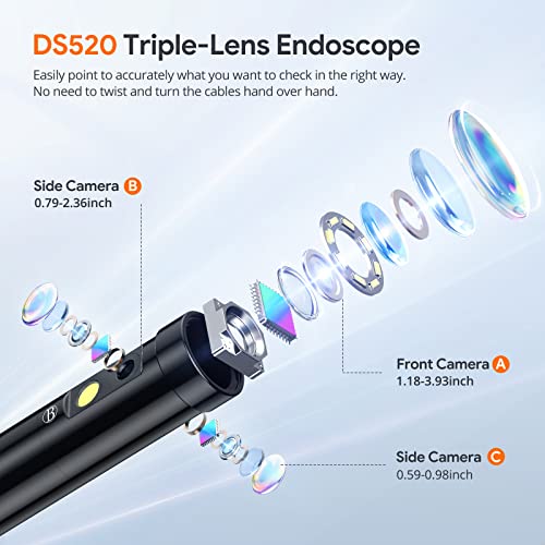 【Upgraded Triple-Lens with Split Screen】: Upgraded triple-lens offers direct front or two side views, and the 180° button and split-screen feature help quickly get the desired angle without twisting cables. Hold the 180° flip button to switch between five viewing modes. and focal ranges of 1.2-3.9in (front cam A), 0.8-2.4in (side cam B), and 0.6-0.9in (side cam C) make it easy to diagnose difficult problems.
