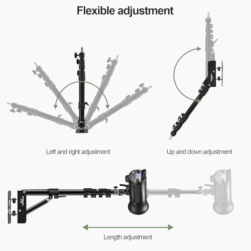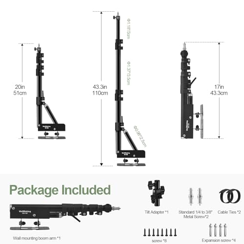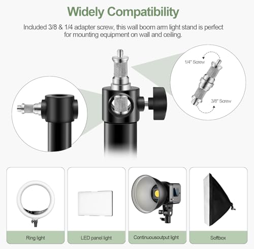 【Wide Application】 The wall mount ring light boom arm with 1/4” and 3/8” adapter screw is compatible with most equipment. It work well with LED video lights, Monolight, Strobe flash, reflector, microphone, camera, and all lighter-weight studio gear. Lend a hand in optimizing your studio space (Barbershop/Salon suite/Beauty Salon/Music studio/Photography Studio/Live Streaming, and so on)