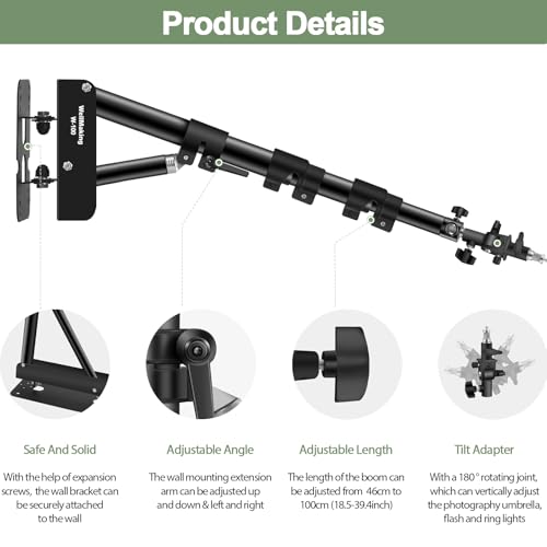 Wellmaking Wall Mount Triangle Boom Arm 39.37inch/100cm, Ring Light Mount Support 180°Flexible Rotation Comes with Tilt Swivel Mount for Studio Video Light, Monolight, Photography, Softbox, Reflector