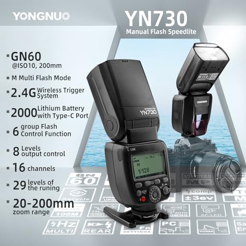 YONGNUO YN730 Flash Speedlite, with 2000mAh Lithum Battery, GN60 2.4G Wireless with Standard Hot Shoe, Master Slave Mode for Canon Nikon Olympus Sony Fuji Cameras
