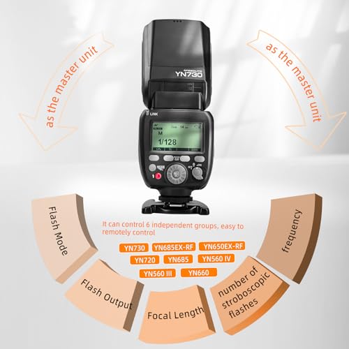 【Supports Radio Transmission Master and Slave Function】YN730 flash realizes 6-group Flash Control Function Easily. When used as a master control unit, the YN-730 strobe light can control the flash mode, brightness and focal length of up to 6 subordinate units. When used as slave unit, YN730 speedlite can receive the radio transmission trigger signal from Yongnuo YN730, YN560 IV, YN650EX-RF, YN685EX-RF, YN660, RF603 (II), YN560TX (II), RF605, RF602.
