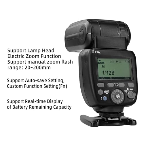 【High Guide Number, Fast recycling Time】GN60@ISO100, 200mm, support M, Multi flash modes, support set-top, radio master mode, radio slave mode, wireless optical slave trigger mode(S1, S2), the zoom range is 20, 24, 28, 35, 50, 70, 80, 105, 135, 200mm